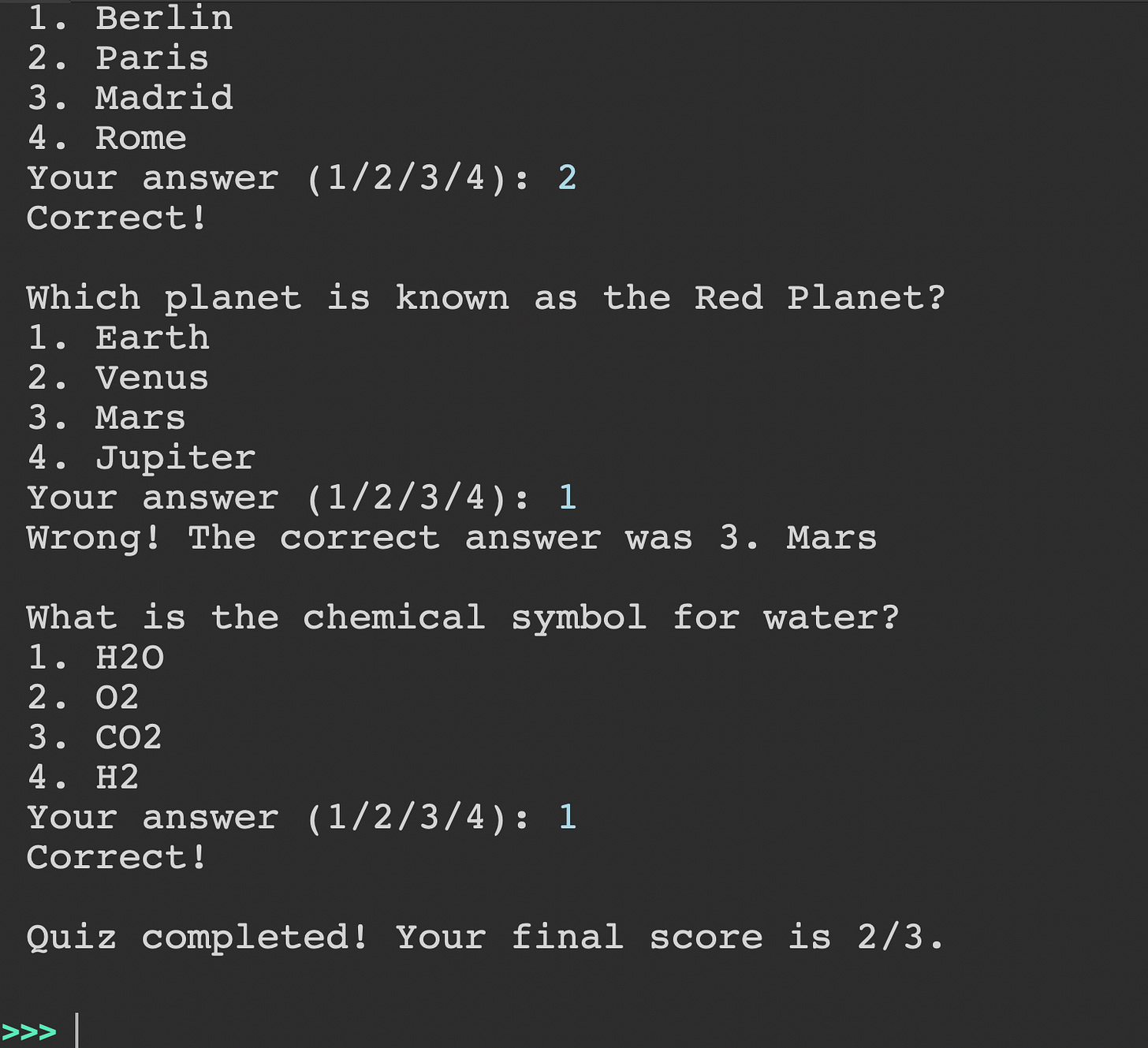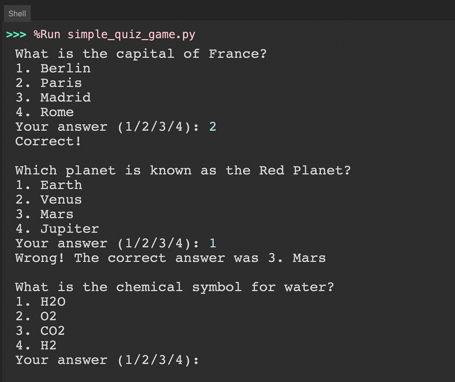 quiz_questions = [ ("What is the capital of France?", ["Berlin", "Paris", "Madrid", "Rome"], 2), ("Which planet is known as the Red Planet?", ["Earth", "Venus", "Mars", "Jupiter"], 3), ("What is the chemical symbol for water?", ["H2O", "O2", "CO2", "H2"], 1), ]Prerequisites