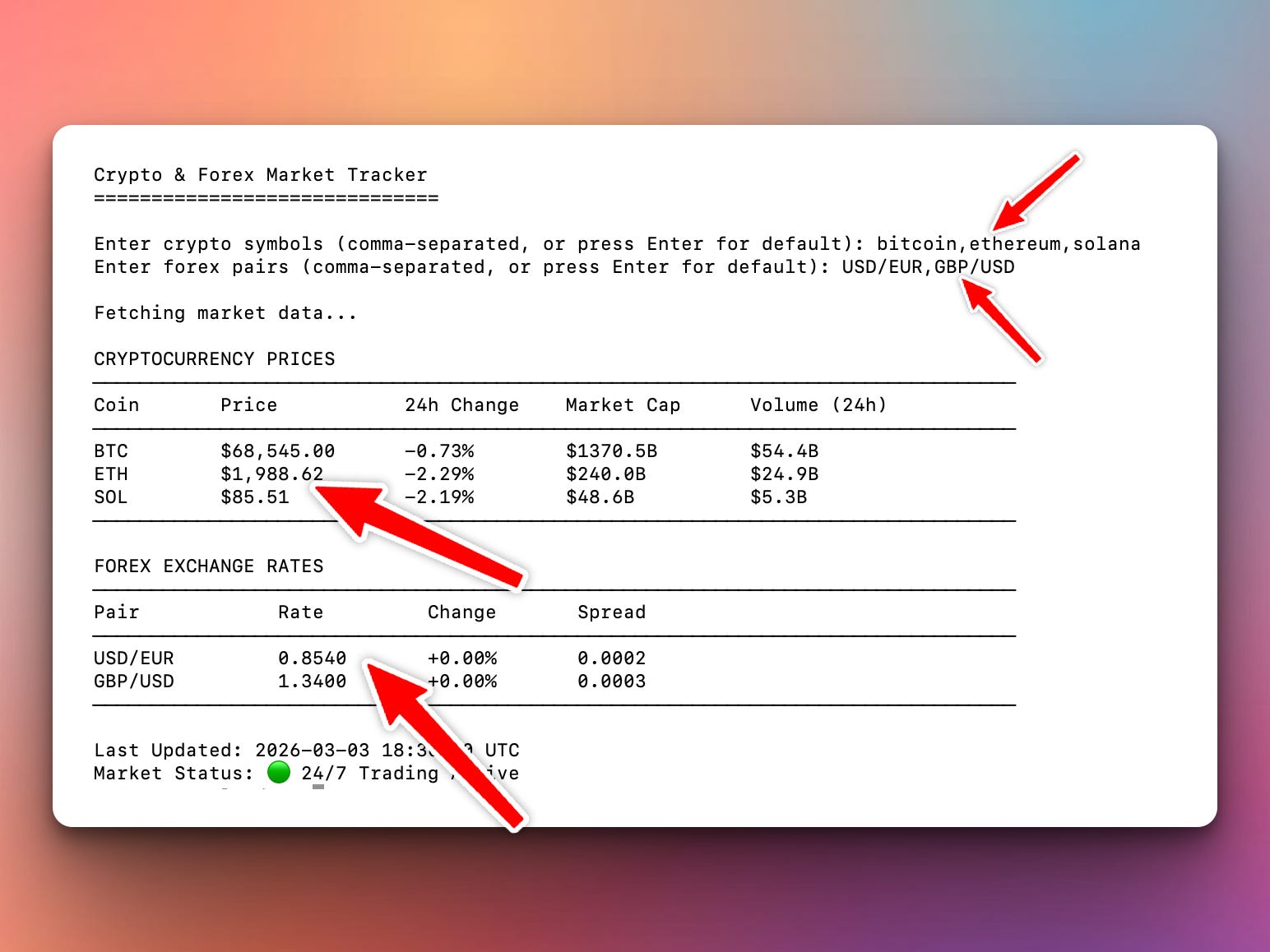 We’re starting with the foundation: we’re creating a command-line tool that fetches real-time cryptocurrency prices and forex exchange rates. Track Bitcoin, Ethereum, and major currency pairs all in one place.