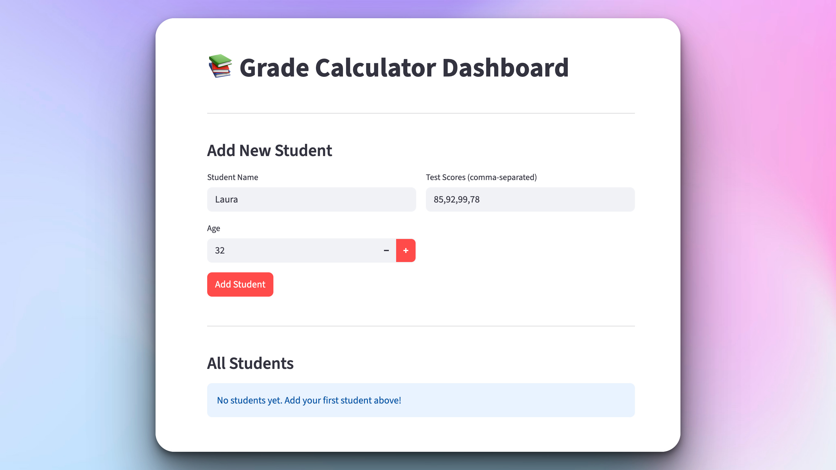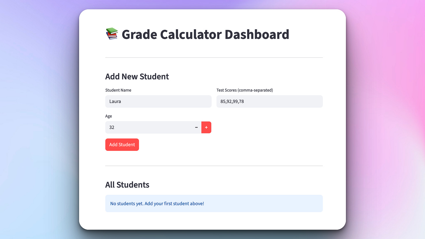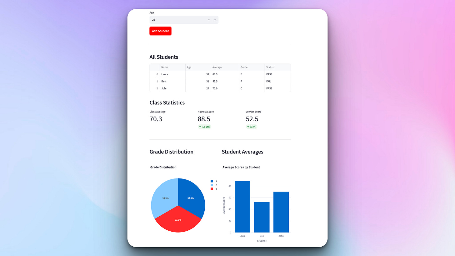 Today we’re taking our grade calculator to the web! We’ll build a beautiful interface with Streamlit that lets you add students, view all records, and see visual analytics with charts showing grade distribution and performance trends.
