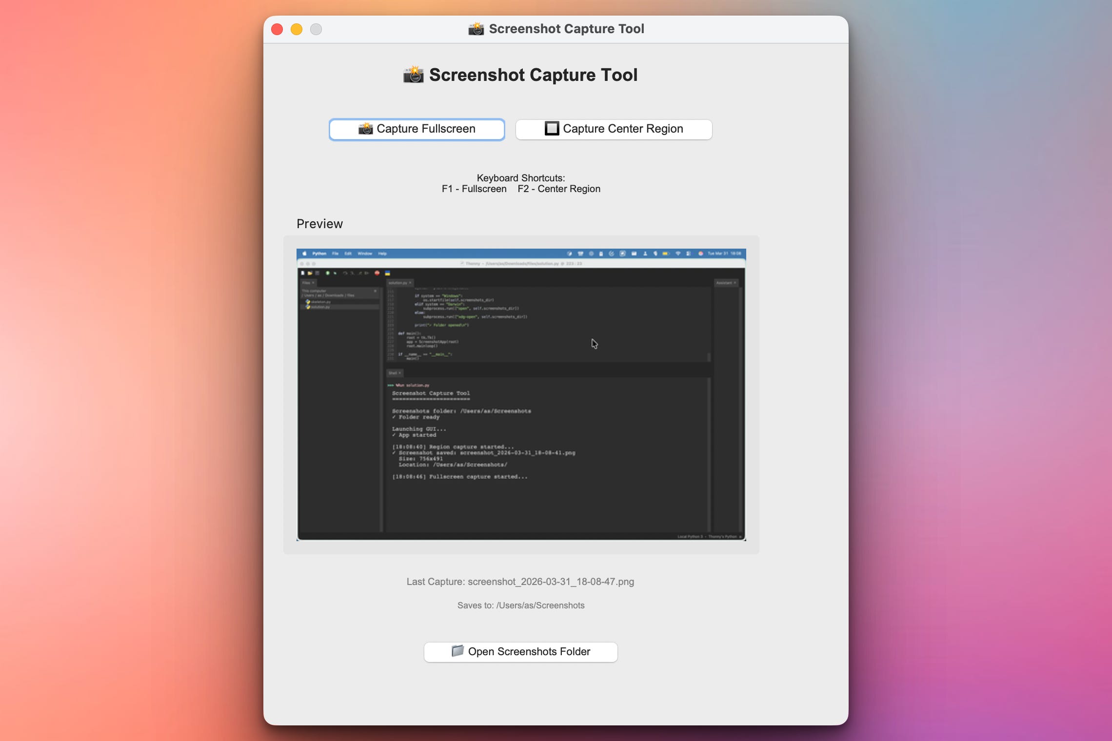 Why users love this: No more fumbling with system screenshot tools or paying for premium apps. Capture fullscreen, grab center regions, auto-save with timestamps, preview instantly — all with keyboard shortcuts. Your own professional screenshot tool!