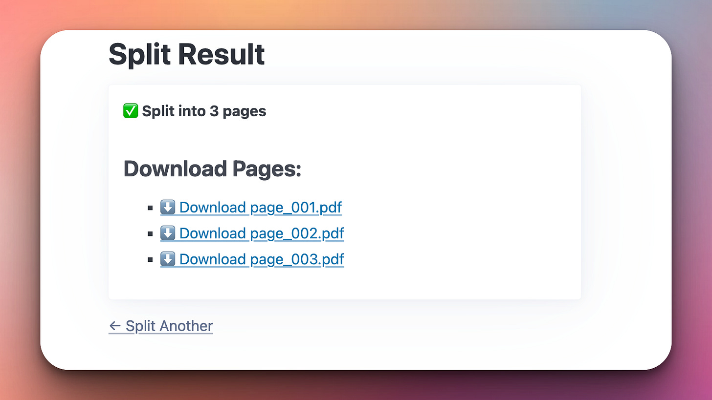 Once the user presses the “Split into Pages” button they instantly get the results: