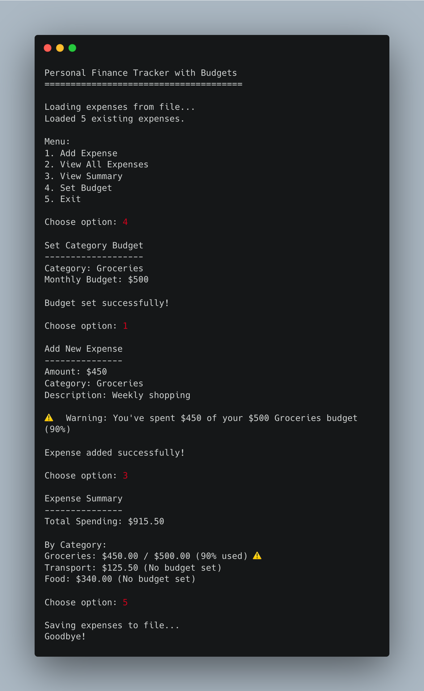 Really smart progression adding persistance here. I've built similar trackers before and dunno why but people always skip the CSV storage step and jump straight to databases, which is overkill for personal finance apps. The budget threshold at 80% is clever, gives users actionable alerts before they actualy blow the limit not just after.