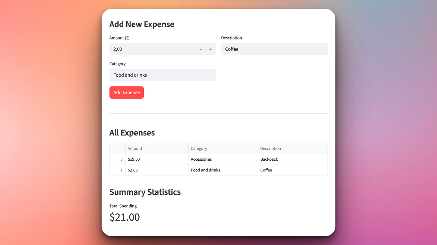 Today we’re taking everything we’ve built and wrapping it in a modern web interface using Streamlit. We’ll add interactive forms, data tables, and visual charts showing your spending patterns.