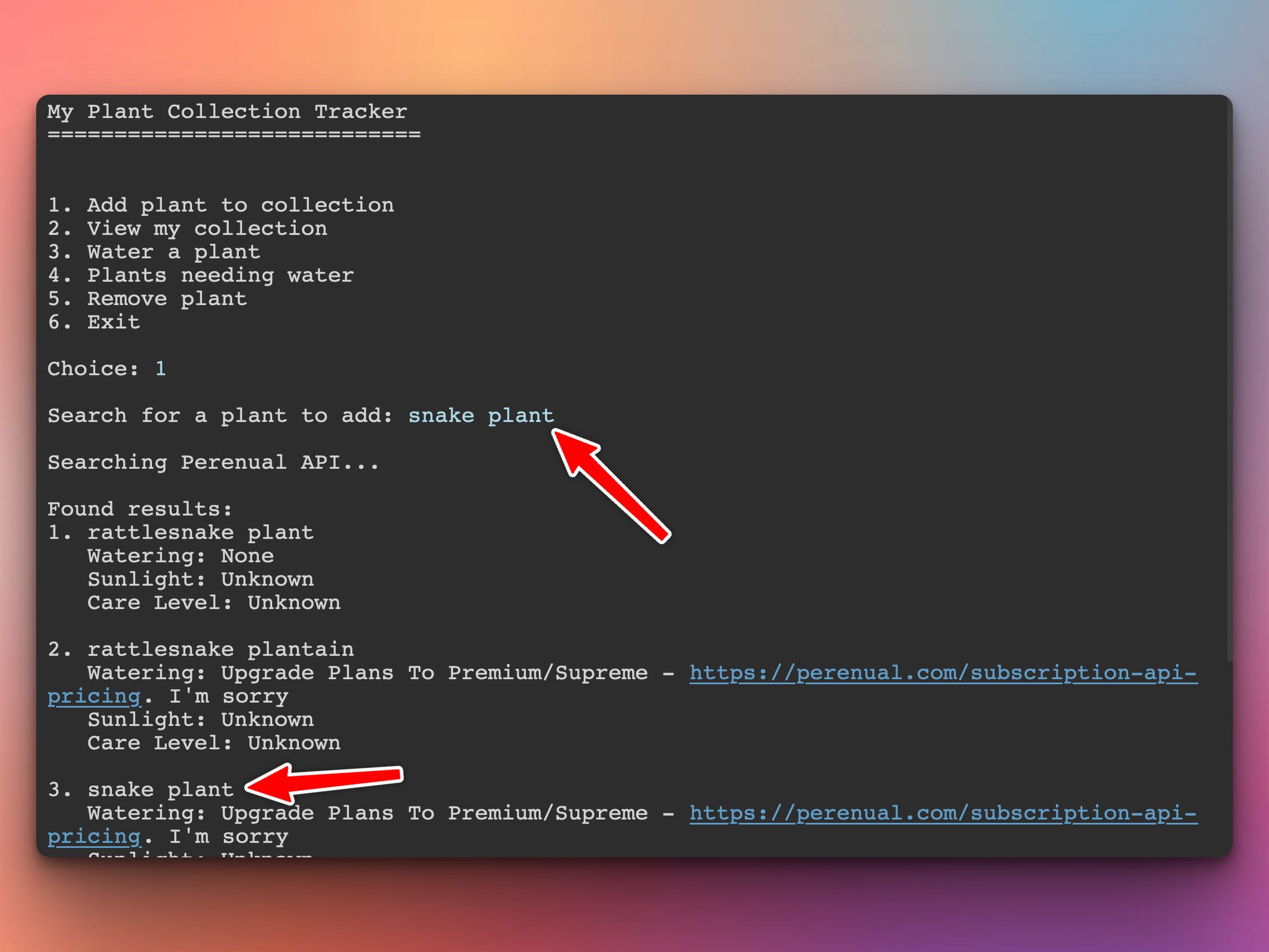 The user can search plants in the database. For example, here the user searches for the “snake plant” and the program returns a few results related to that plant name: