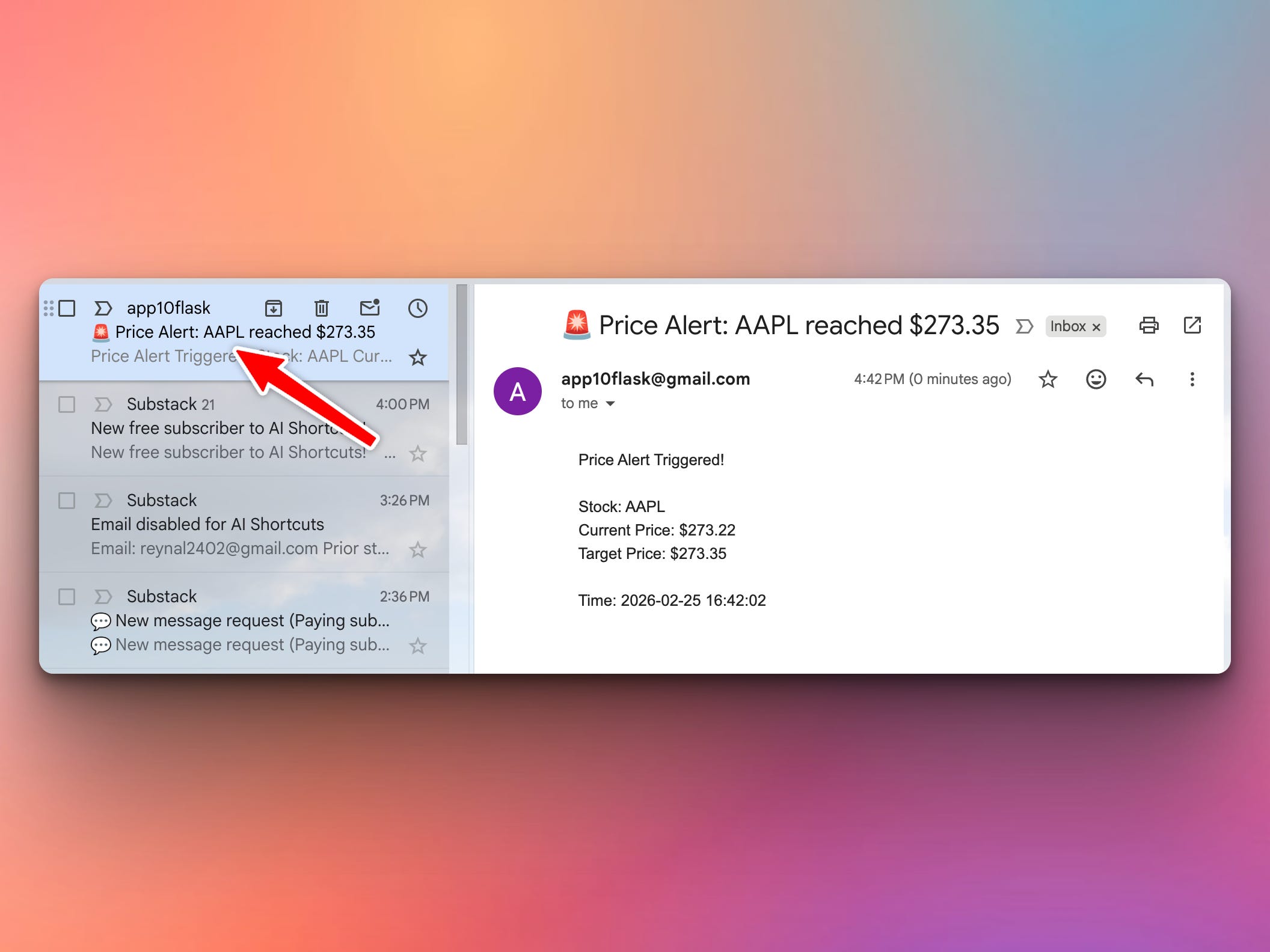 When that price is reached, the program will trigger a price alert and send an email to the user. Here is the actual email I received for this particular example of Apple stock: