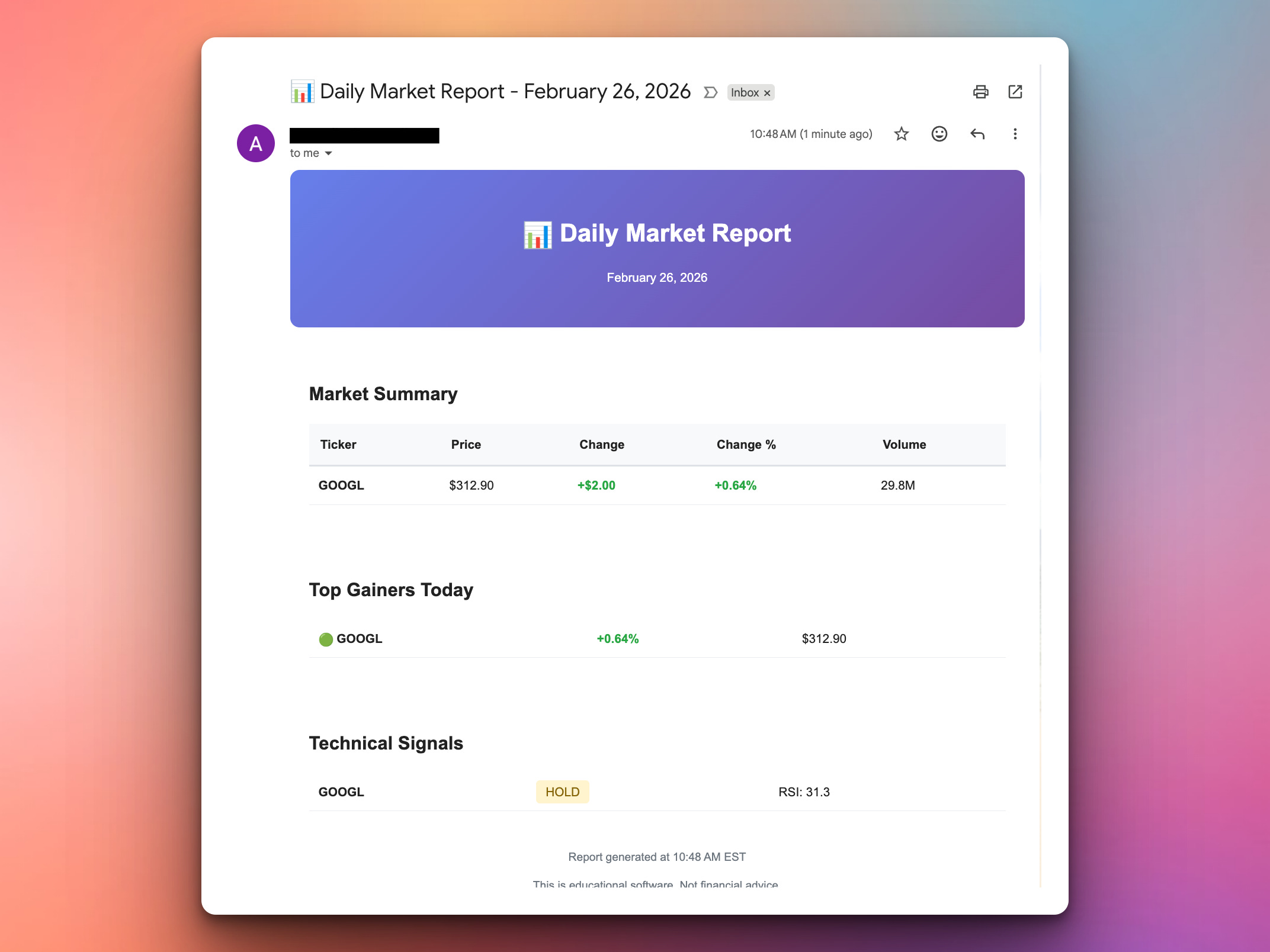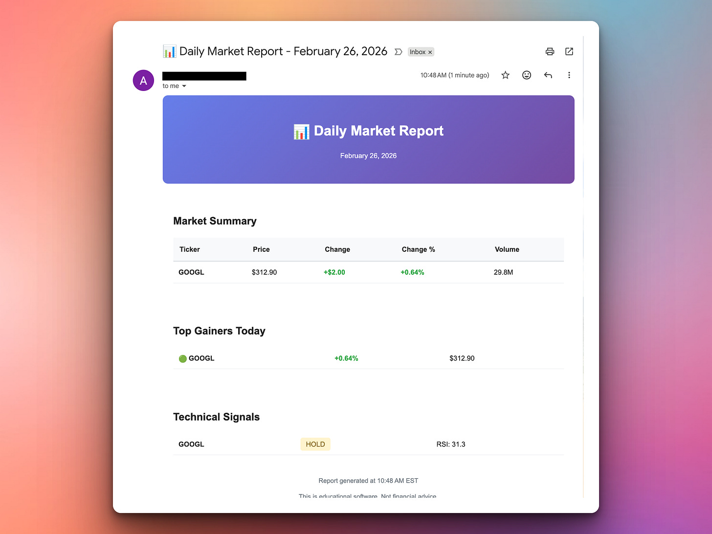 No more checking websites manually. Your personalized market report arrives automatically every morning, perfectly formatted and ready to read!
