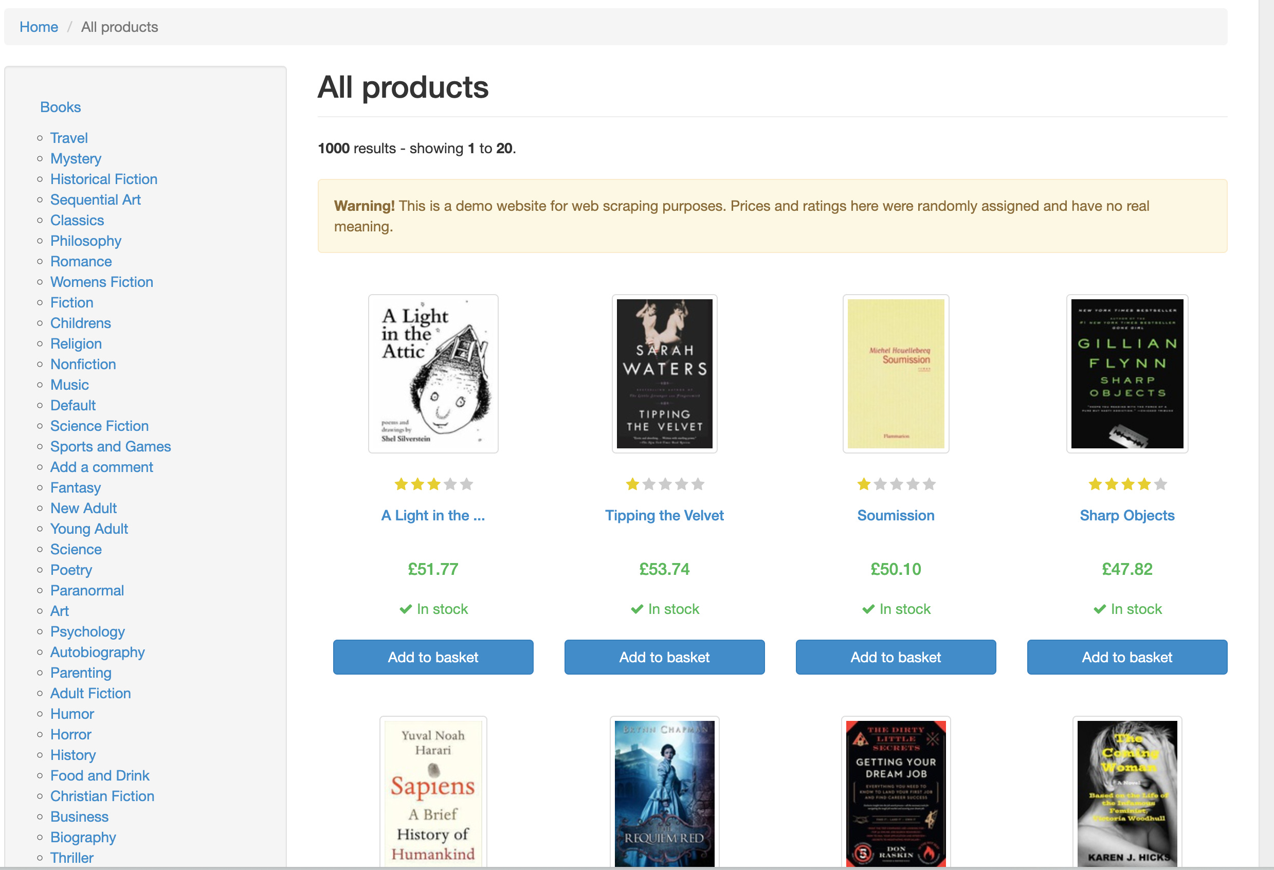 Scrapes data from books.toscrape.com (a practice scraping site that looks like below)