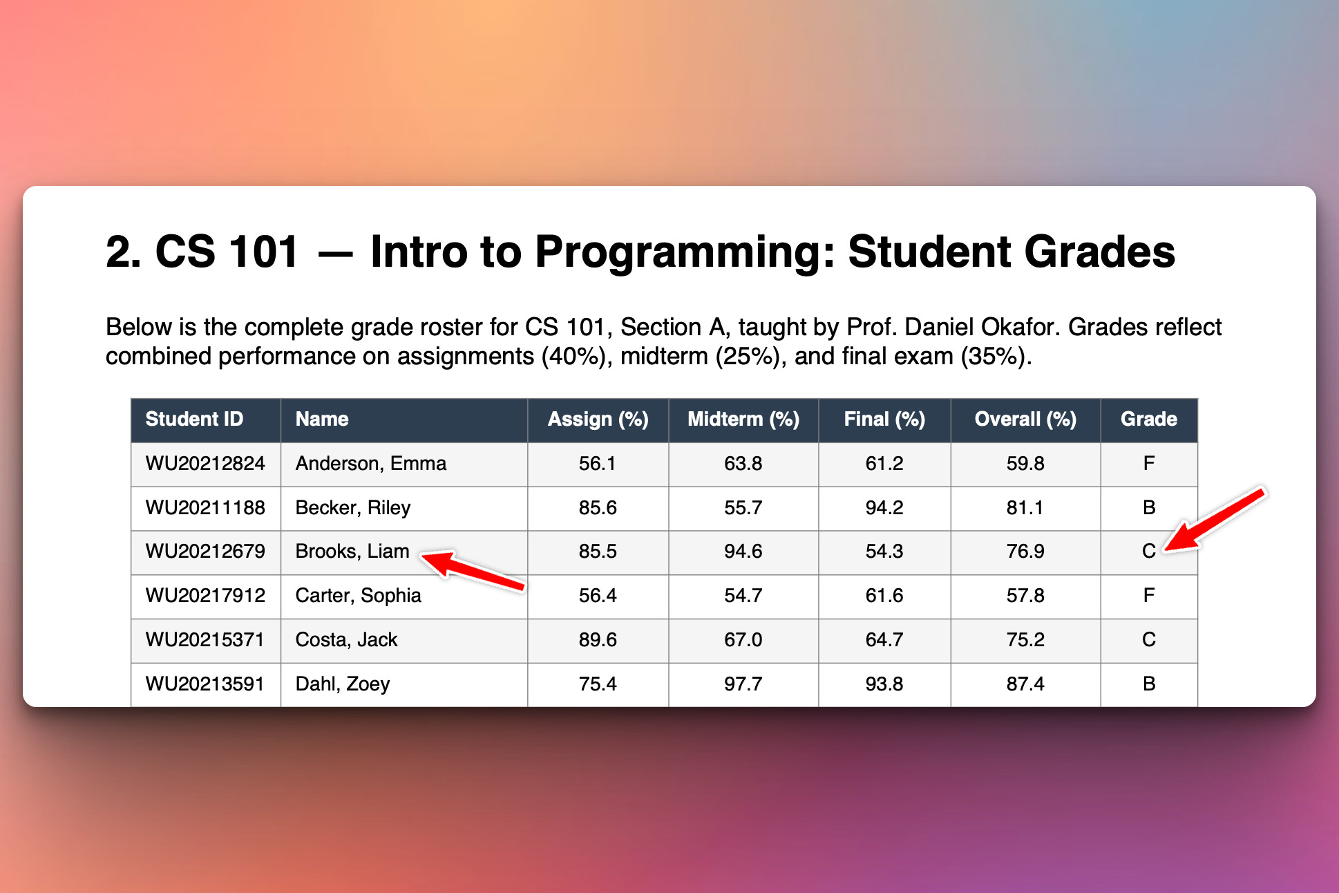 As you can see our program answered the user’s question (in blue) stating that Liam Brooks’ grade is C which is actually correct. That’s his grade in the PDF document.