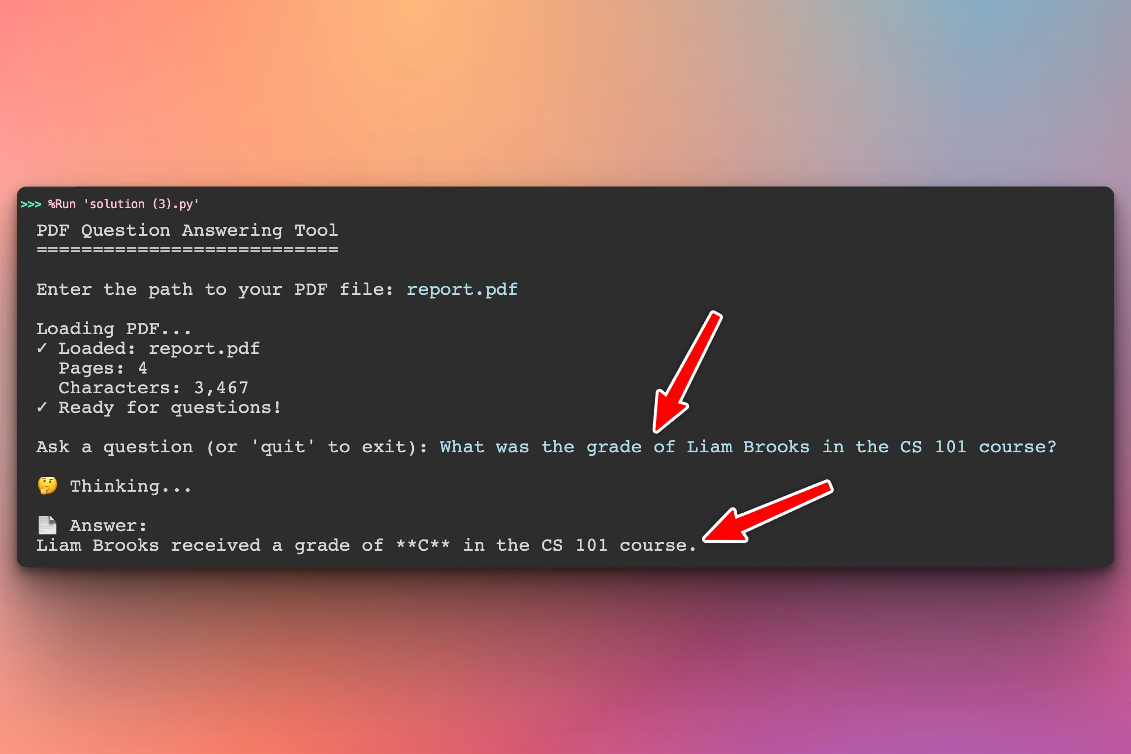 When you run the program, it will ask you to provide the name of your PDF file and lets you ask a question about that PDF.