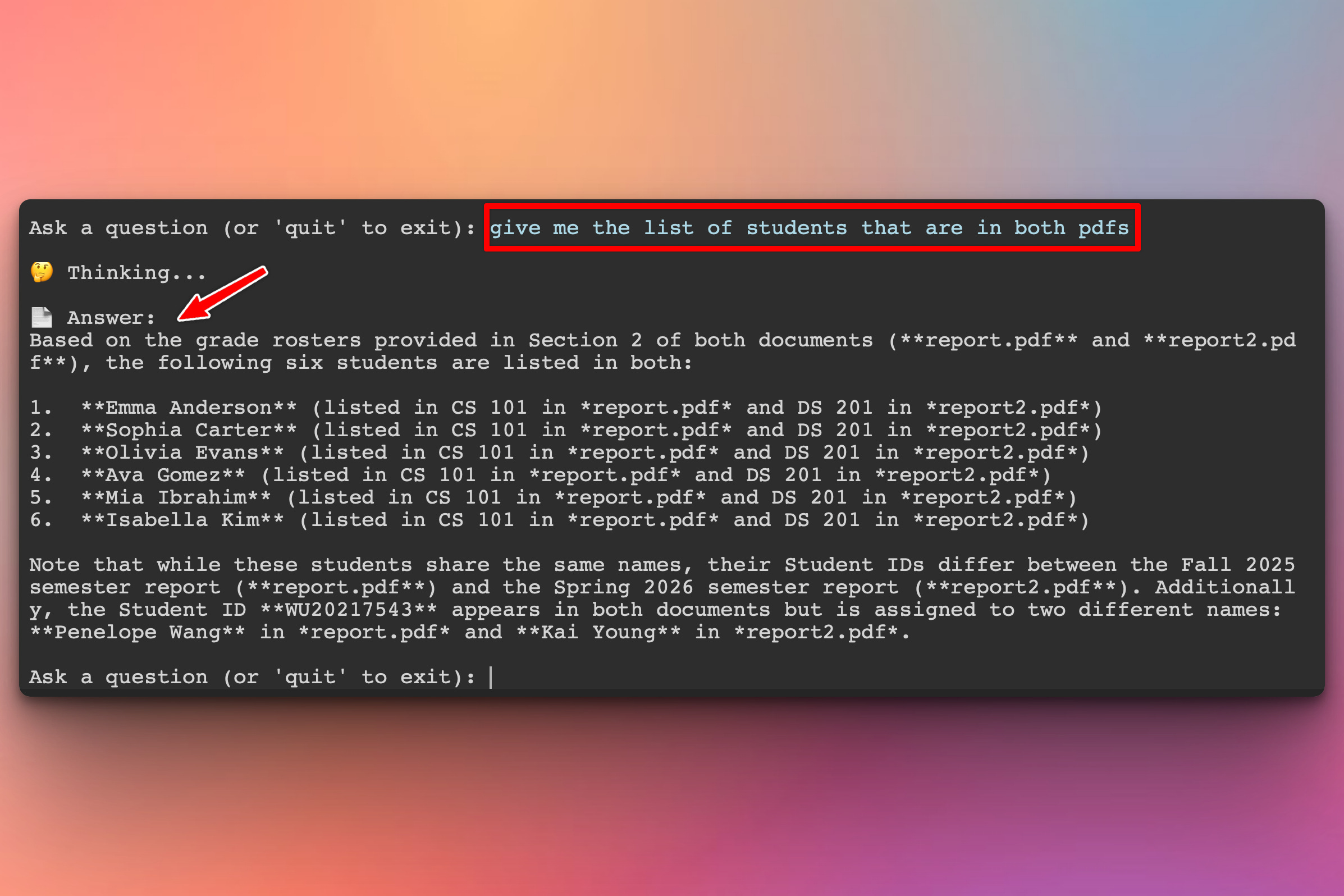 In the next step, the user asks a question about the information contained in the PDF files. In our example, we have some university student data in the PDFs and some students are in both PDFs so below we ask the program to give us the student names that are in both documents: