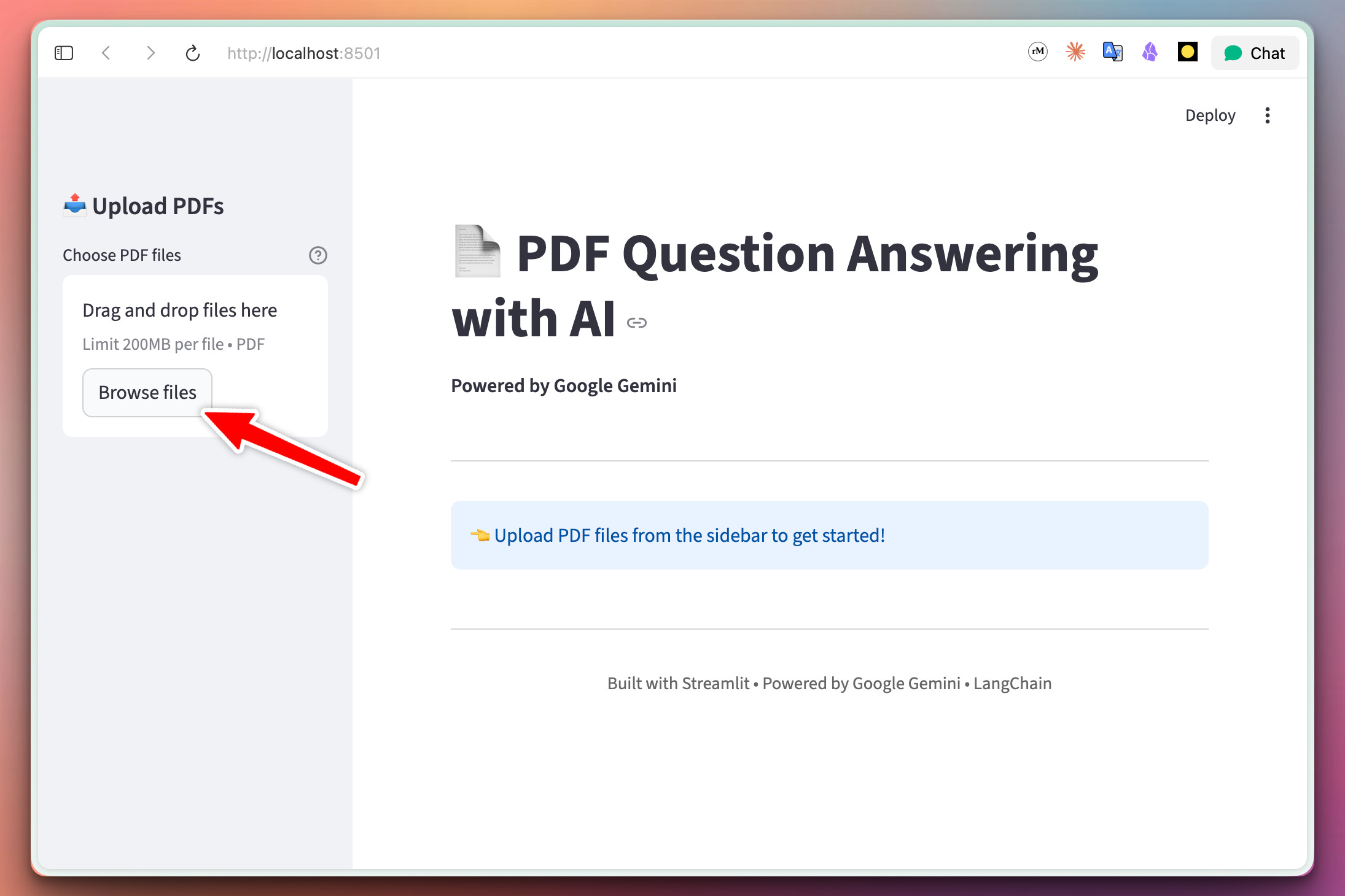 The user can click the “Browser files” button to upload PDF files. Then, they can chat with their PDFs: