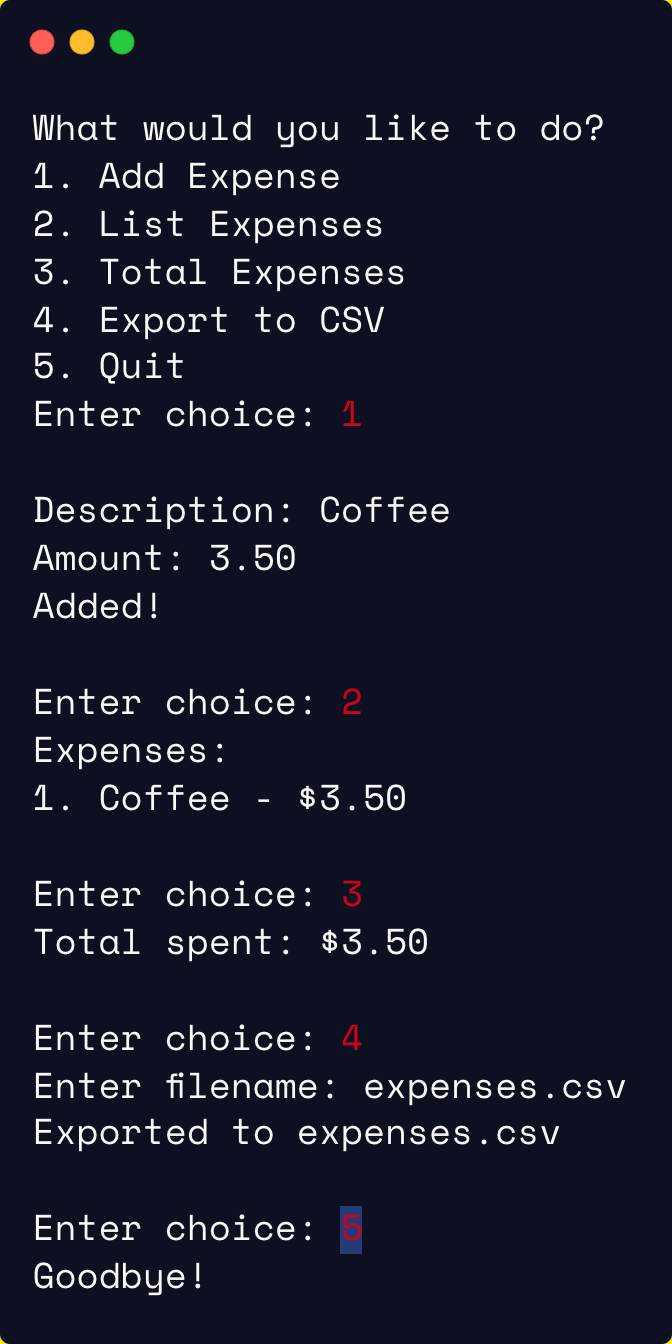 Use a loop to let the user choose actions: Add, List, Total, Export, or Quit.