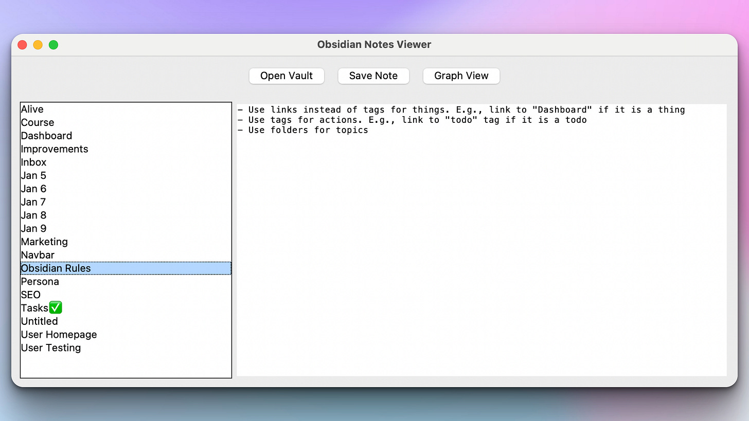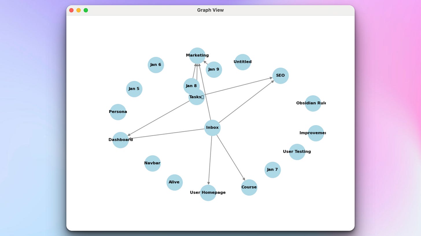 Your task for today is to create a desktop notes application that reads local markdown files, supports wiki-style linking with [[brackets]], and visualizes connections between notes in an interactive graph — bringing the power of Obsidian’s knowledge graph to your own Python app. Lets to it!