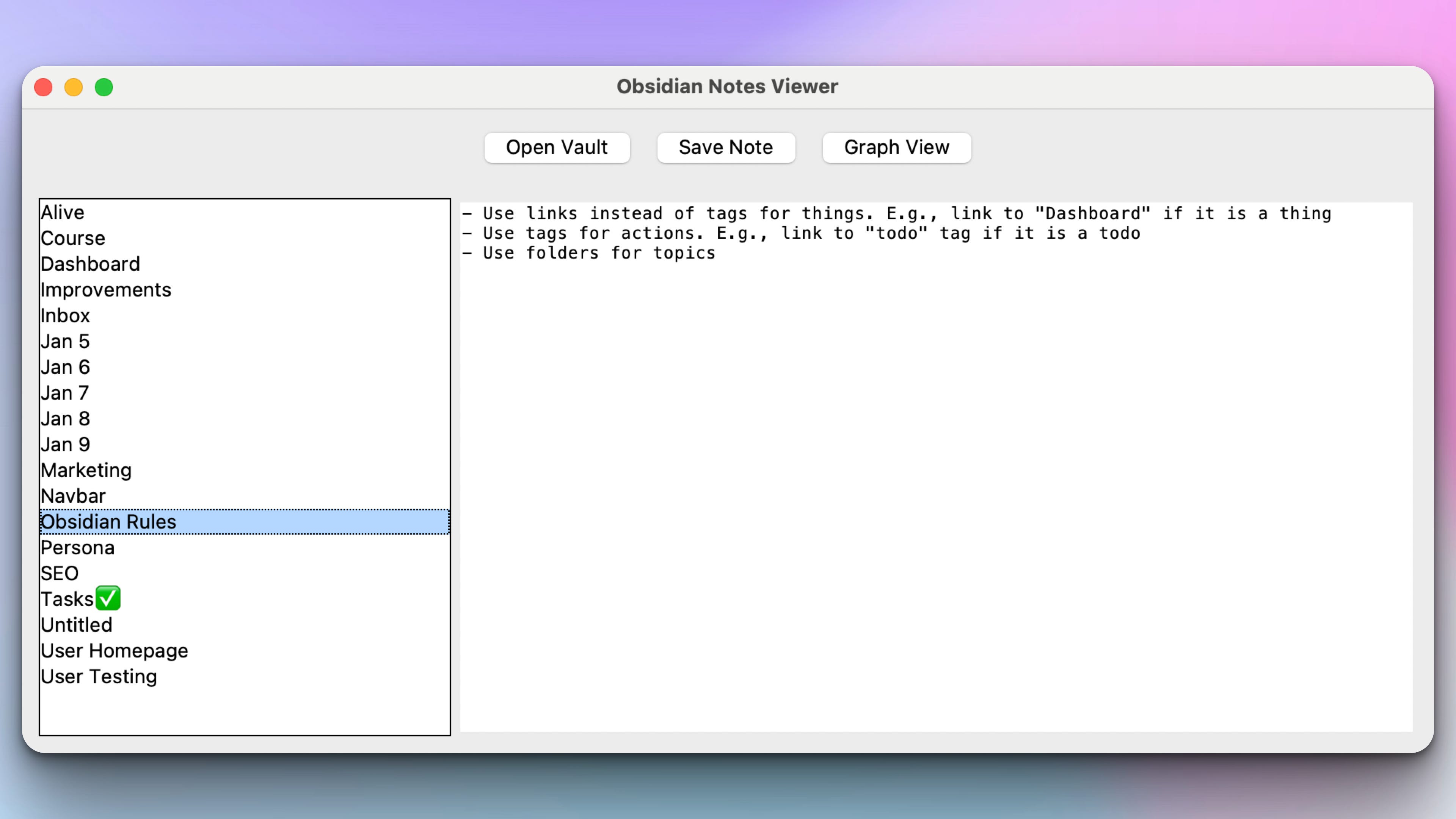 Create an Obsidian-style notes viewer that: