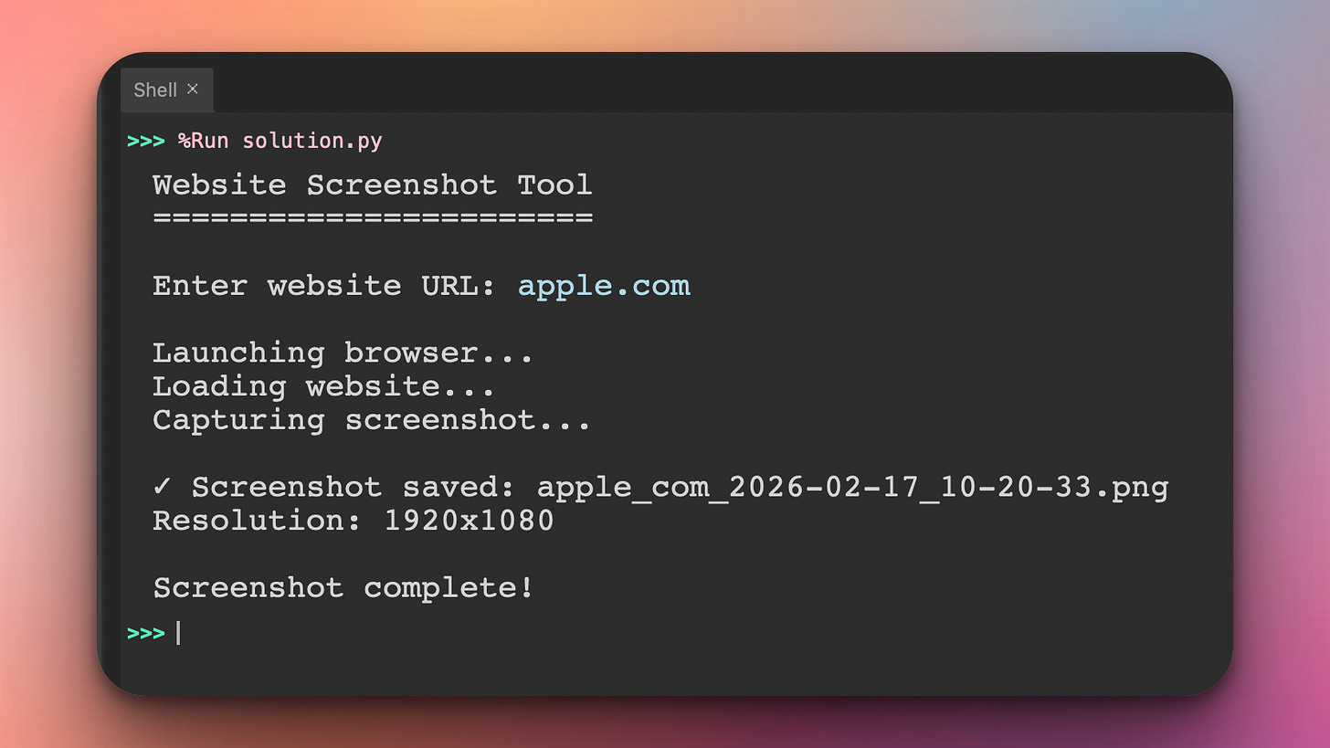We’re starting with the foundation: we’re creating a command-line tool that captures full-page screenshots of any website. Just provide a URL, and get a perfect screenshot saved to your computer.