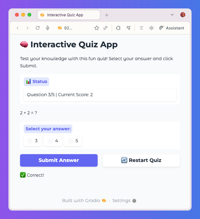 Your task for today is to build an interactive quiz game using Python classes and a Gradio web interface. This project teaches how to design a system with multiple interconnected classes and wrap it into a user-friendly web app.
