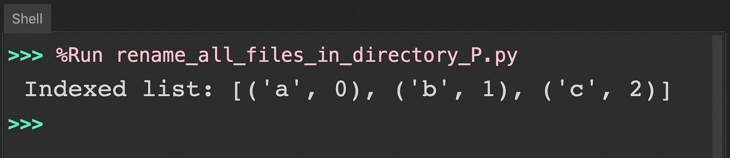 [('a', 0), ('b', 1), ('c', 2)]Each tuple in this new list consists of an element from the original list paired with its corresponding index.