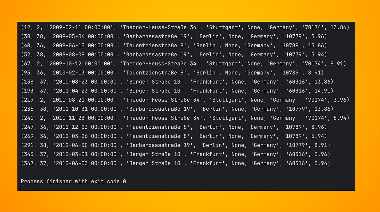 invoicestable for rows whereBillingCountryis 'Germany' andTotalis >= 2.0Prints each result row
