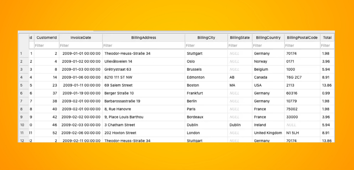 In this project, you’ll learn how to connect to an SQLite database using Python and execute a SQL query with specific conditions. You’ll extract invoice records from a table where the billing country is Germany and the total amount is greater than or equal to 2.0.