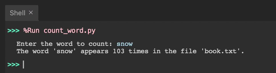 The user can enter any word (e.g., snow), and the program should find out how many occurrences of that word exist in the book.txt file and print out a message: