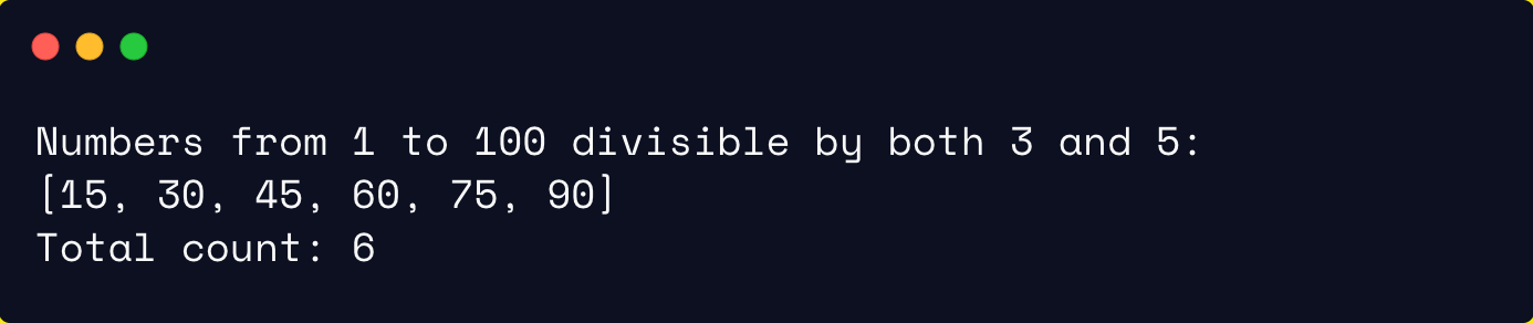 Not sure how to begin? Click the Show Hint button below to see how to loop through the numbers and check if each one is divisible by both 3 and 5.