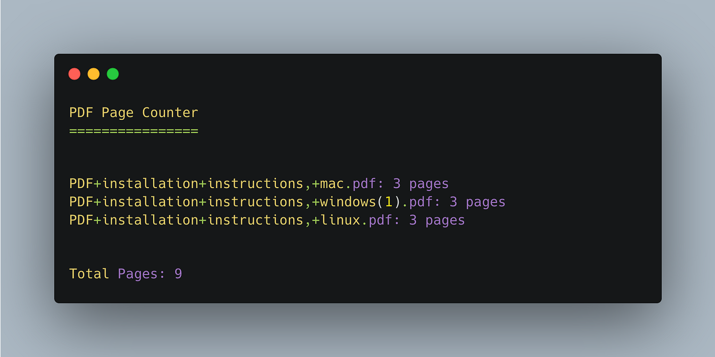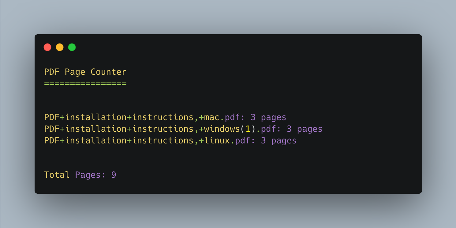 Your task for today is to create a PDF page counter script in Python that scans a folder for PDF files and counts the pages in each file. This project introduces you to working with PDF files using PyPDF2.