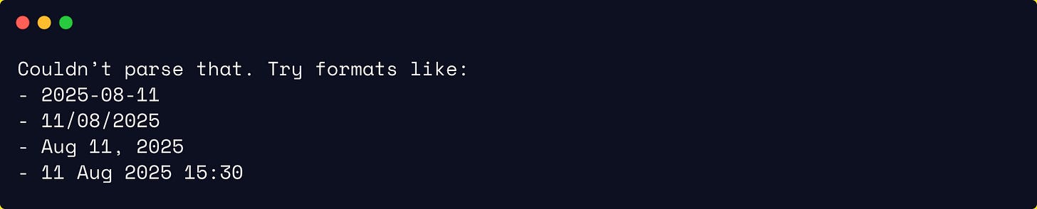 YYYY-MM-DD,DD/MM/YYYY,Aug 11, 2025, etc.Parse robustly. If parsing fails, reprompt with hints and examples until a valid date (and optional time) is provided.