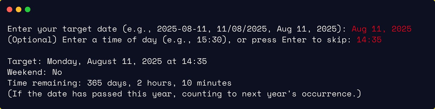 Your task for today is to build a robust countdown tool that accepts a target date (and optional time) in multiple formats, parses it safely, and shows a live-style summary of how long is left. You’ll practice date parsing, error handling, recurrence logic, and human‑friendly formatting.