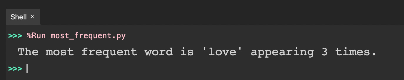 Your program should find the most frequent word and print out a message similar to the following where the most frequent word (i.e., “love“) is is mentioned.