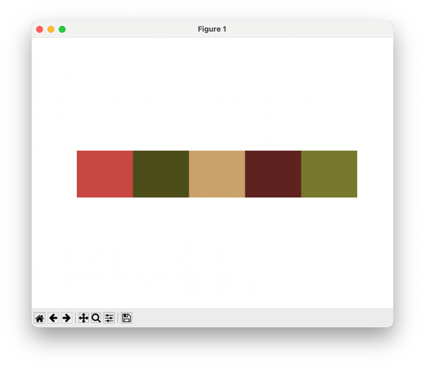 After running the program, it should generate and display the color palette for the input image using matplotlib. For the image above, the color palette would be this: