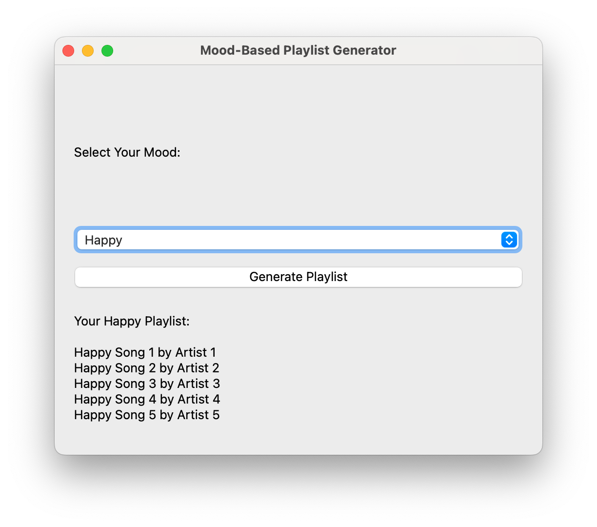 Today, we will build a Mood-Based Playlist Generator with Python that generates a playlist based on the user’s mood. By simply choosing from options like “Happy,” “Sad,” or “Energetic,” the app will provide a selection of songs that match that mood. The app will fetch song recommendations from a mock API (to keep it simple), and you can expand this by integrating it with real music APIs like Spotify or YouTube. We will use the PyQt6 library for this, but you can use any other GUI library