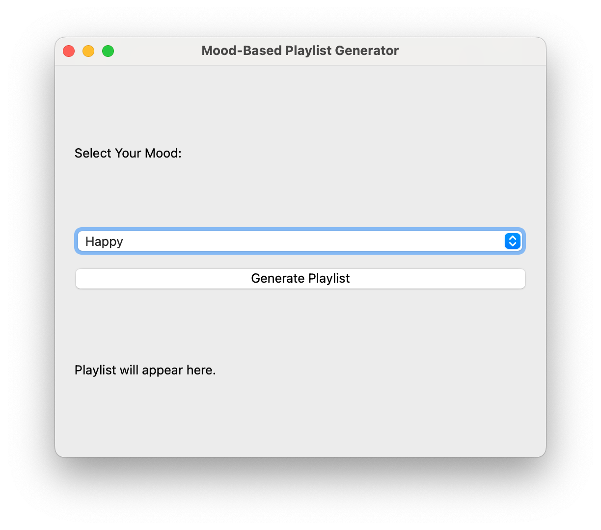 The GUI lets the user select their mood from a list of three moods (Happy, Sad, and Energetic).