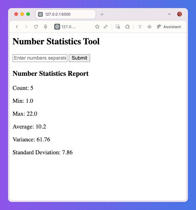 Your task for today is to take the Number Statistics Tool and turn it into a Flask-based web app. Instead of using the command line, users will enter numbers into a web form, and the app will display a neatly formatted statistics report in the browser. This teaches you how to connect backend Python logic with a web interface using Flask.