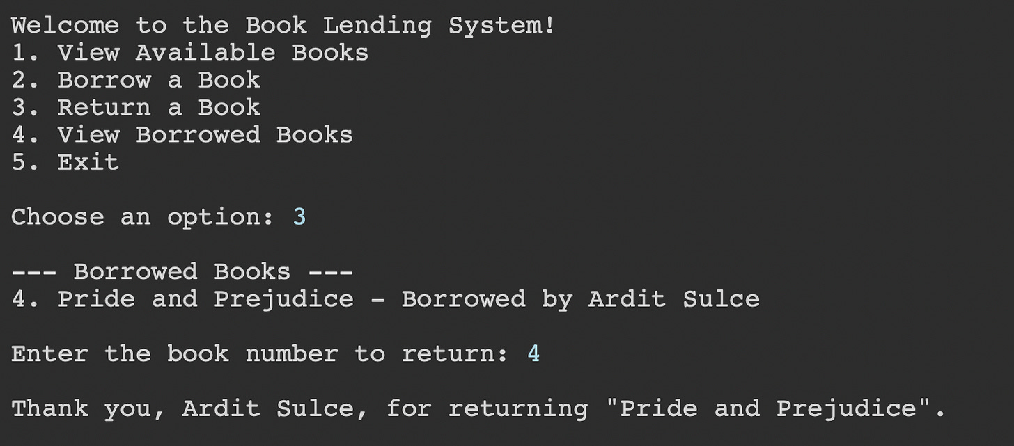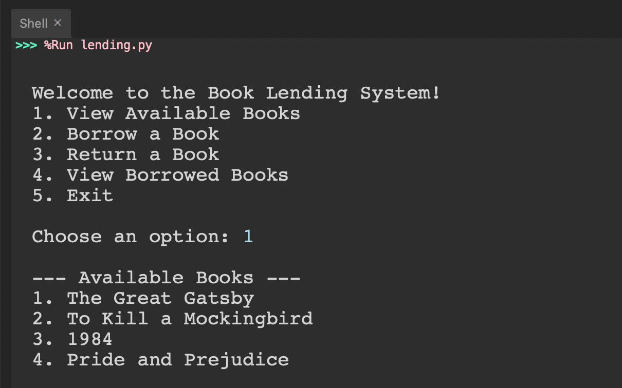 class BookLendingSystem: def __init__(self): self.available_books = { 1: "The Great Gatsby", 2: "To Kill a Mockingbird", 3: "1984", 4: "Pride and Prejudice" } self.borrowed_books = {} def display_menu(self): print("\nWelcome to the Book Lending System!") ... ... def view_available_books(self): ... ... def borrow_book(self): if not self.available_books: ... ... def return_book(self): if not self.borrowed_books: ... ... def view_borrowed_books(self): if not self.borrowed_books: ... ... def run(self): while True: self.display_menu() choice = input("\nChoose an option: ").strip() if choice == "1": ... ... system = BookLendingSystem() system.run() Learning Benefits