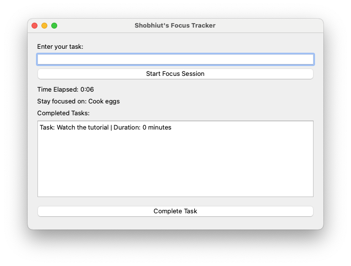 Today, we will build a Focus Tracker App. This app will help users stay productive during focus sessions by tracking the time spent on tasks, giving motivational messages, and allowing break reminders. It’s a simple desktop app with a graphical user interface containing a timer and task management features to boost productivity.