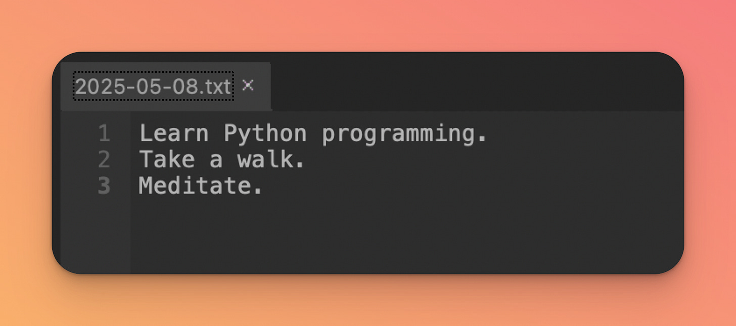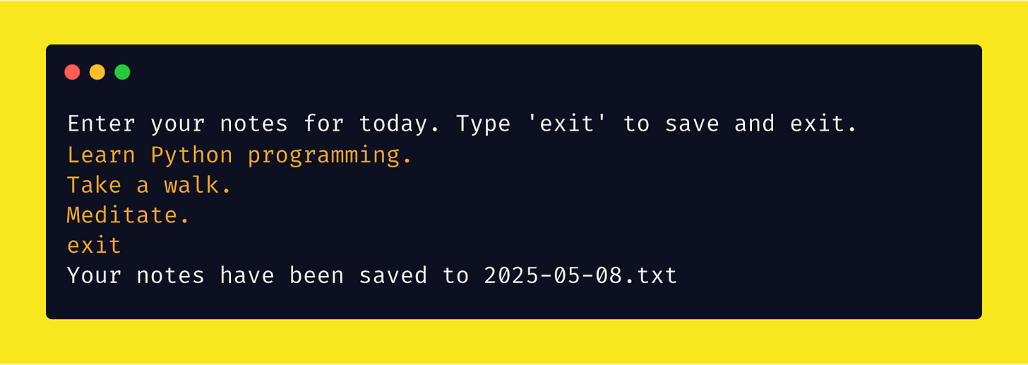 In this project, you’ll build a simple note-taking application that saves user input into a file named with the current date. This is a great way to practice working with dates, file handling, and user input in Python.