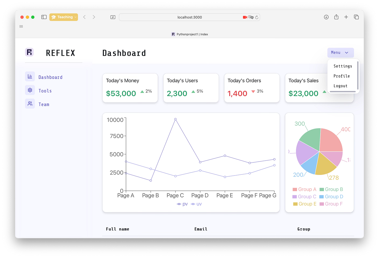 Reflex is a new open-source, full-stack Python framework that makes it easy to build and deploy web apps in minutes. Reflex comes with a large library of UI components ranging from simple buttons to complex graphs and tables.