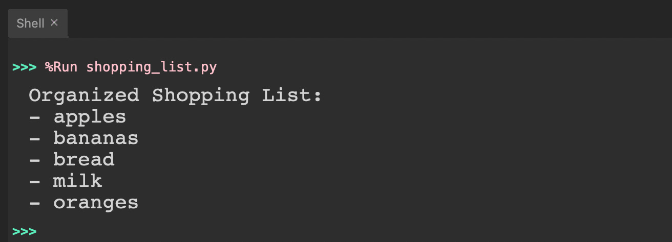 In this project, you’ll create a simple program that organizes a shopping list.