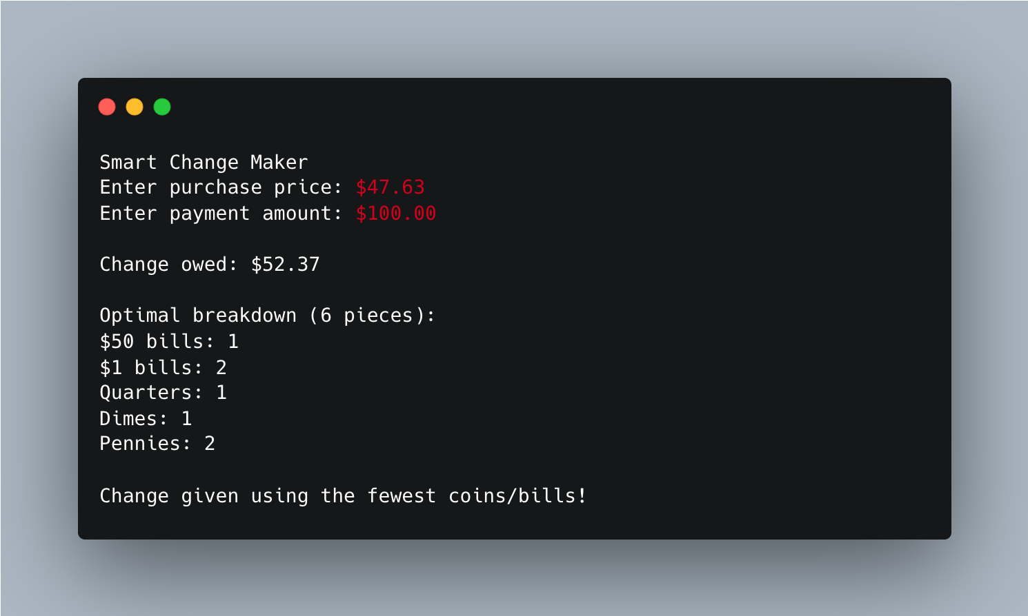 Your task for today is to create a smart change maker program that calculates the most efficient way to make change using the fewest coins possible. This project introduces you to algorithm thinking, optimization, and working with denominations.