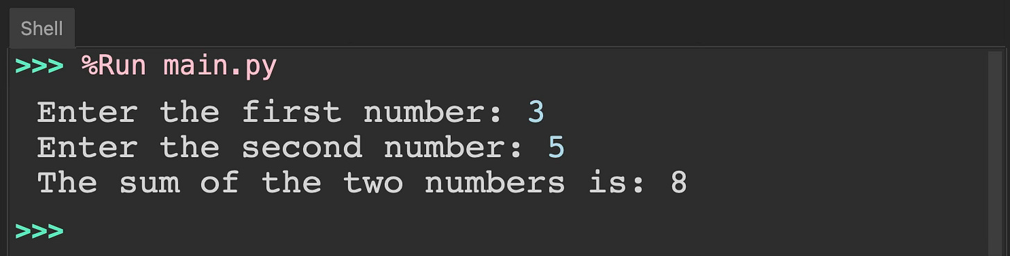 After the user presses Enter, the program adds the two numbers together and displays the result.