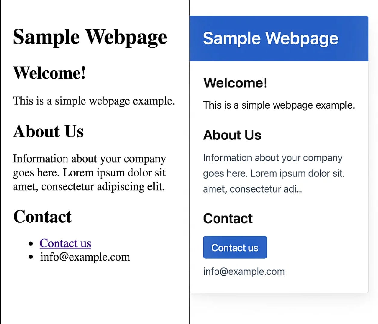 Here is how a webpage would look without CSS or Boostrap (left) and with CSS/Bootstrap (right).