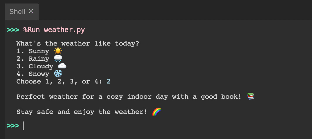 (1) The program prompts the user to choose 1, 2, 3, or 4 depending on the current weather.